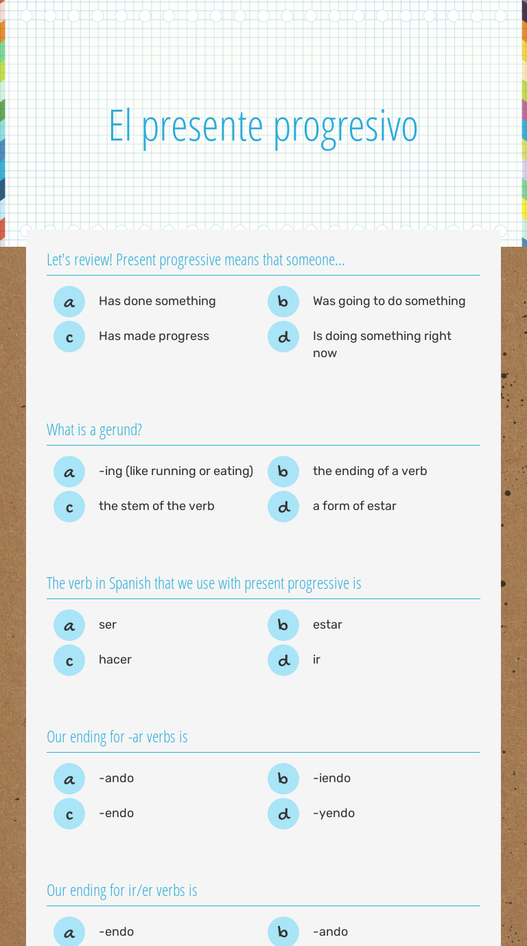 View presente progresivo worksheet (1).pdf from spanish ibsl1n at agoura high. El presente progesivo complete the sentences with the present progressive of . If you would like to get a copy of our beginner spanish workbook you can find it in the link below. 6 hours ago view presente progresivo worksheet (1).pdf from spanish ibsl1n at agoura high. Page 1 uses the present progressive of 12 ar verbs. Presente progresivo | present continuous in spanish. This resource explains the formation of regular and irregular present . Introduction to the present continuous tense El presente progesivo complete the sentences with the present . Students are to conjugate the given verb in the present progressive. Both of these worksheets have a picture to indicate . Worksheet 4 (listen and answer). Page 2 has 12 er and ir verbs.