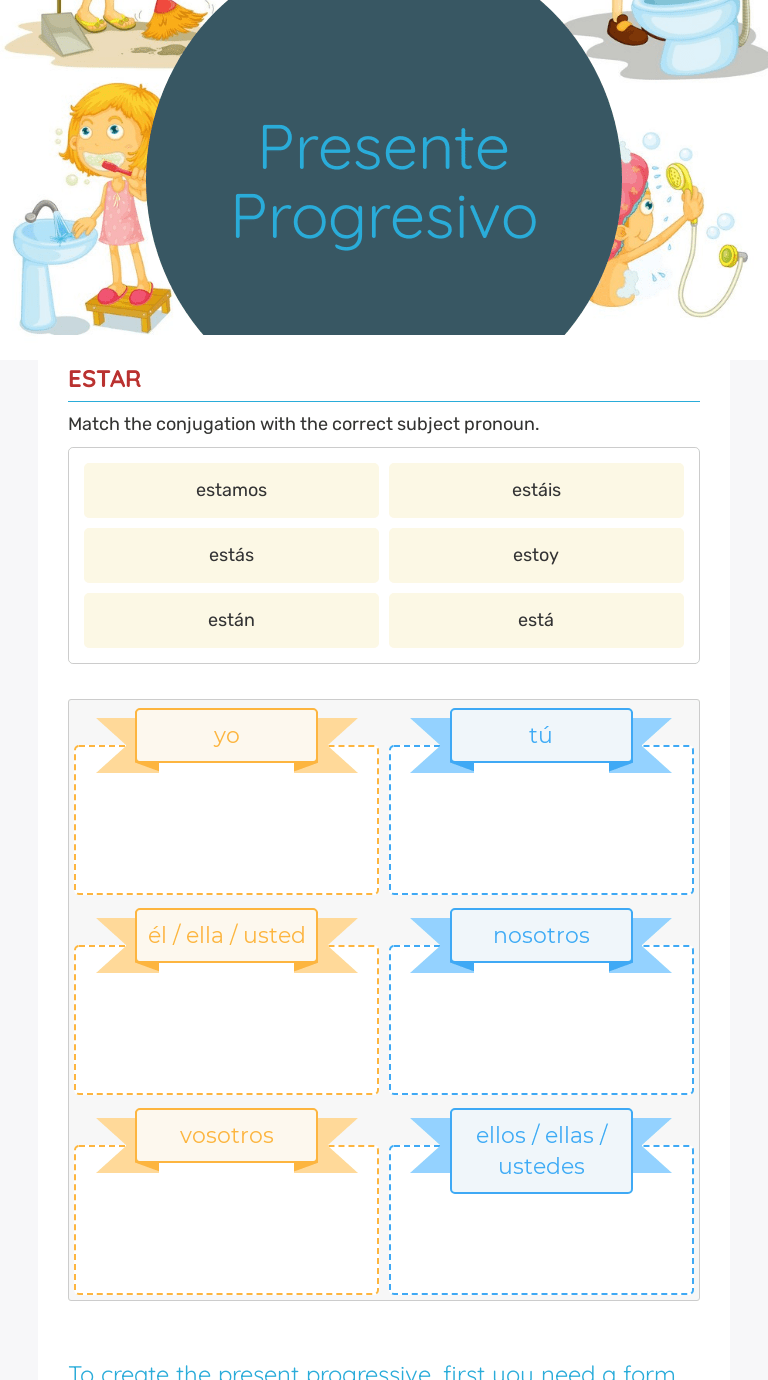 El presente progesivo complete the sentences with the present . Both of these worksheets have a picture to indicate . Students are to conjugate the given verb in the present progressive. Worksheet 4 (listen and answer). El presente progesivo complete the sentences with the present progressive of .